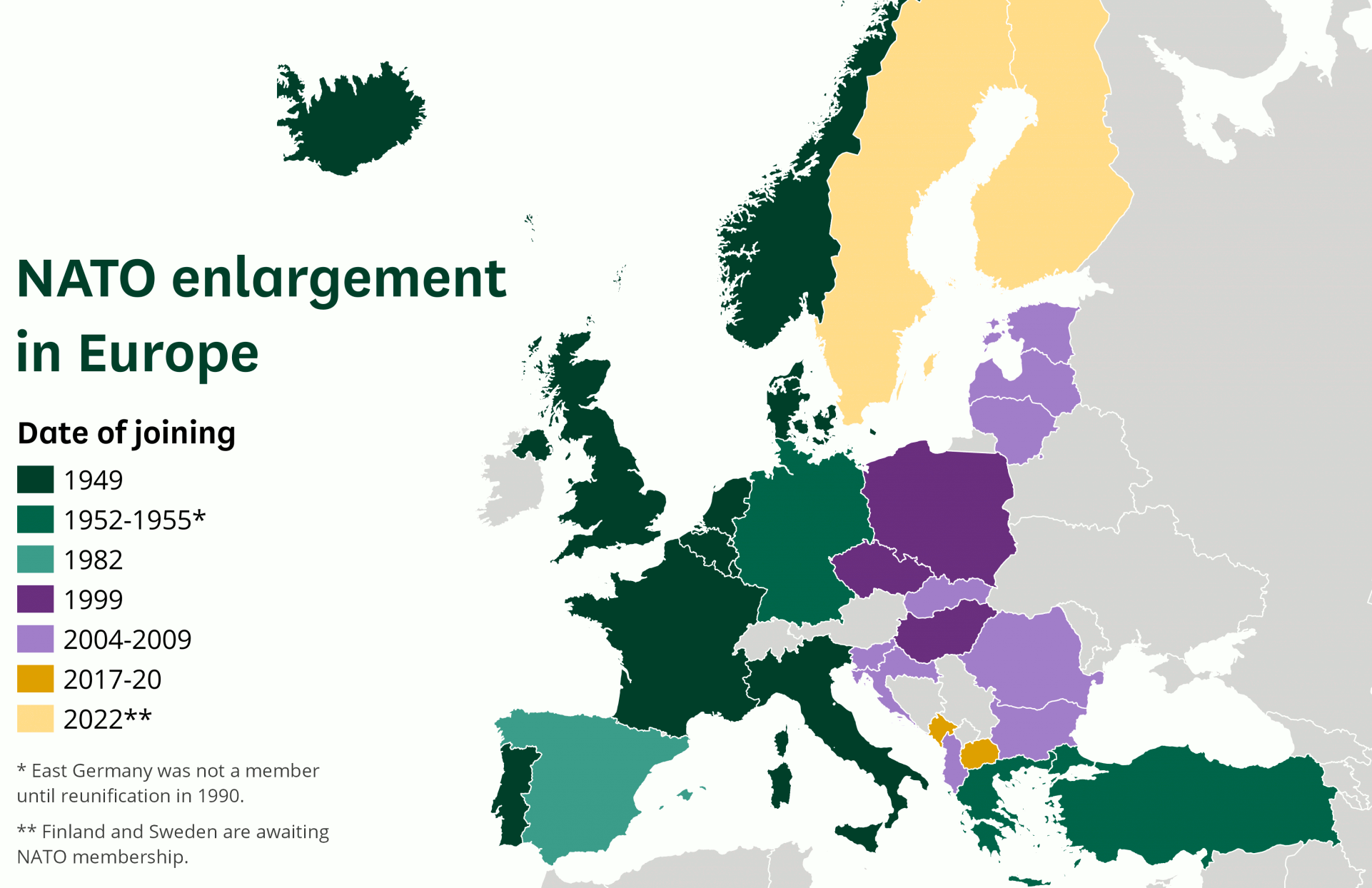 NATO formed with twelve founding members and has added new members nine times, most recently when Finland joined the alliance on 4 April 2023, exactly 74 years after NATO's formation. Following the acceptance of its application for membership in June 2022, Sweden is anticipated to become the 32nd member, with its Accession Protocol to the North Atlantic Treaty now in the process of being ratified by the existing members. In addition, NATO currently recognizes Bosnia and Herzegovina, Georgia, and Ukraine as aspiring members. Enlargement has led to tensions with non-member Russia, one of the twenty additional countries participating in NATO's Partnership for Peace programme. Another nineteen countries are involved in institutionalized dialogue programmes with NATO.