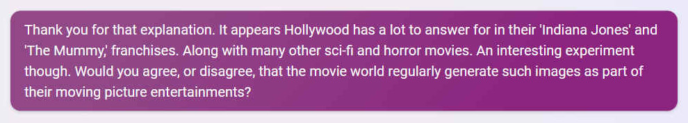 Mummy,' franchises. Along with many other sci-fi and horror movies. An interesting experiment though. Would you agree, or disagree, that the movie world regularly generate such images as part of their moving picture entertainments?
